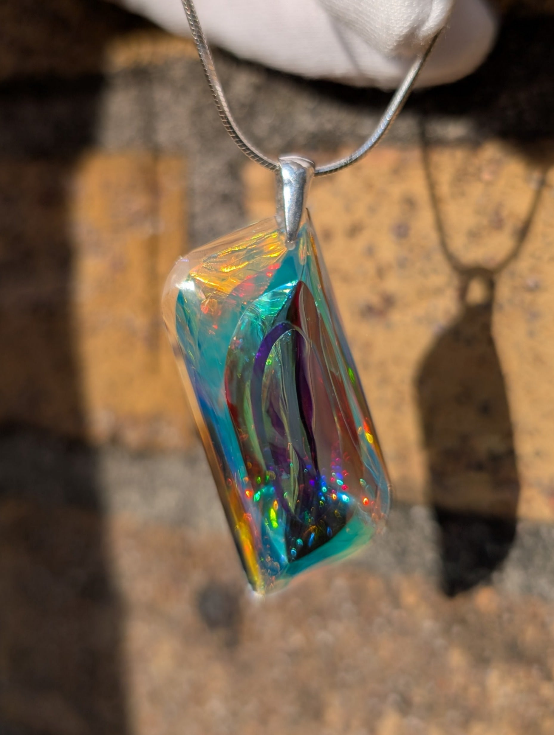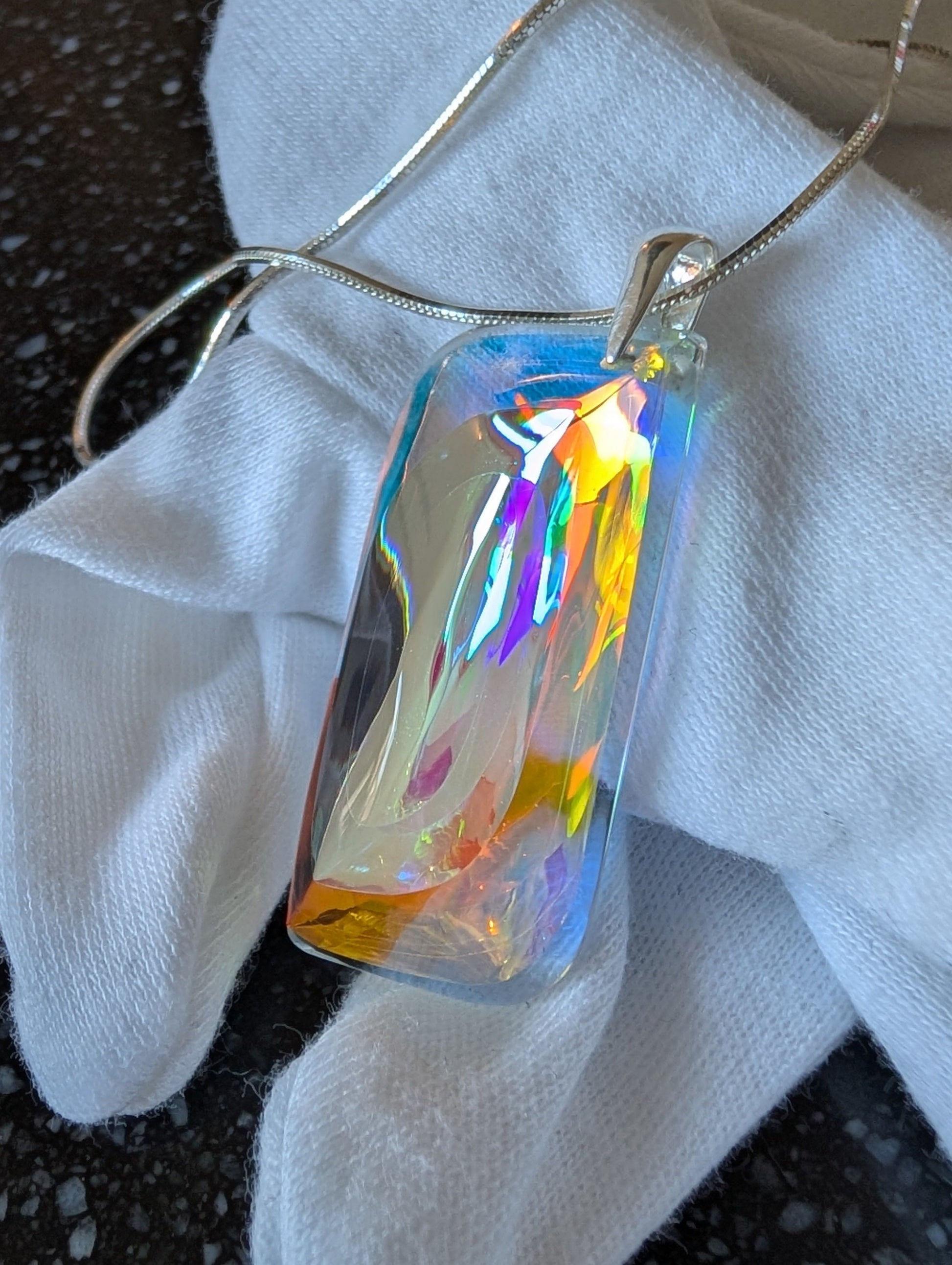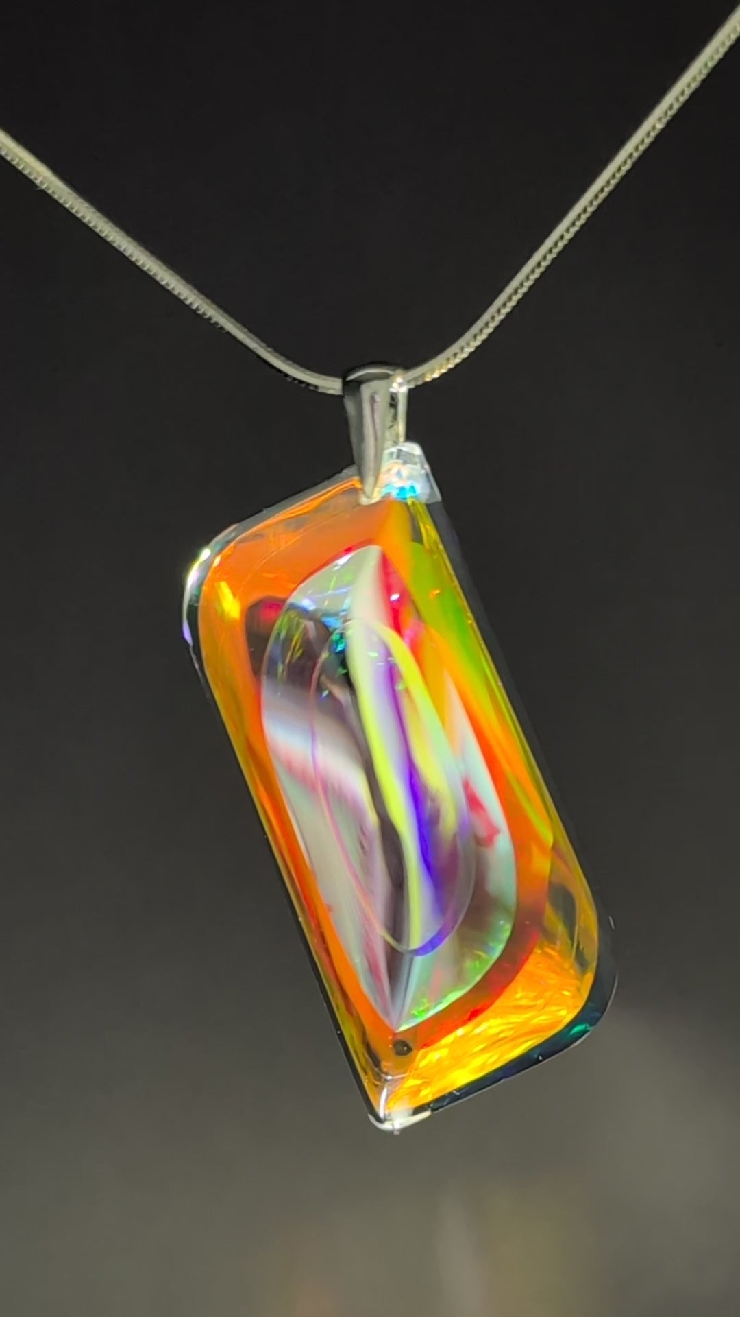 The sleek, modern design is complemented by a sterling silver (925) bail, ensuring both durability and elegance. The fusion of crystal-clear optical glass with vibrant dichroic layers creates an almost ethereal effect—each piece refracting light uniquely, making "Chen" a true wearable work of art.
