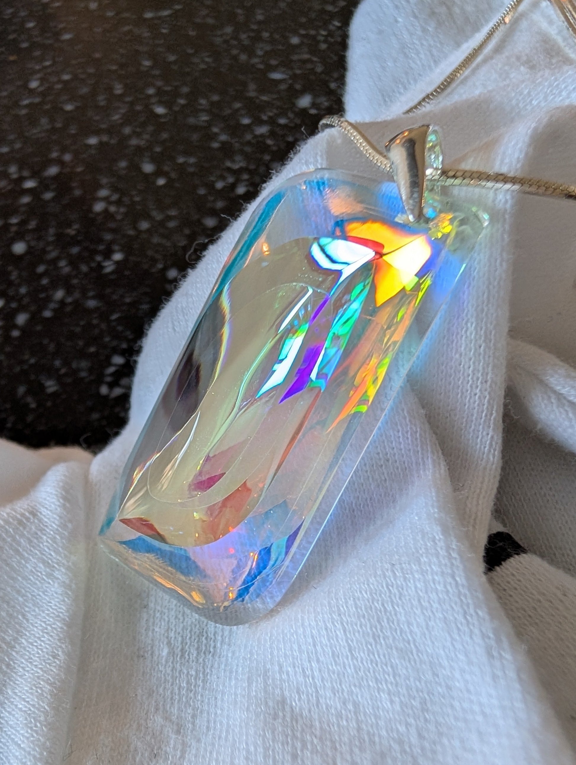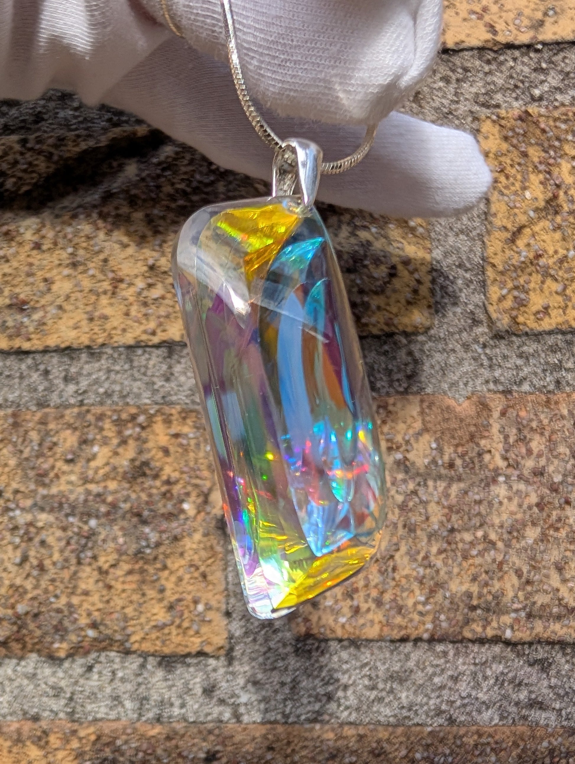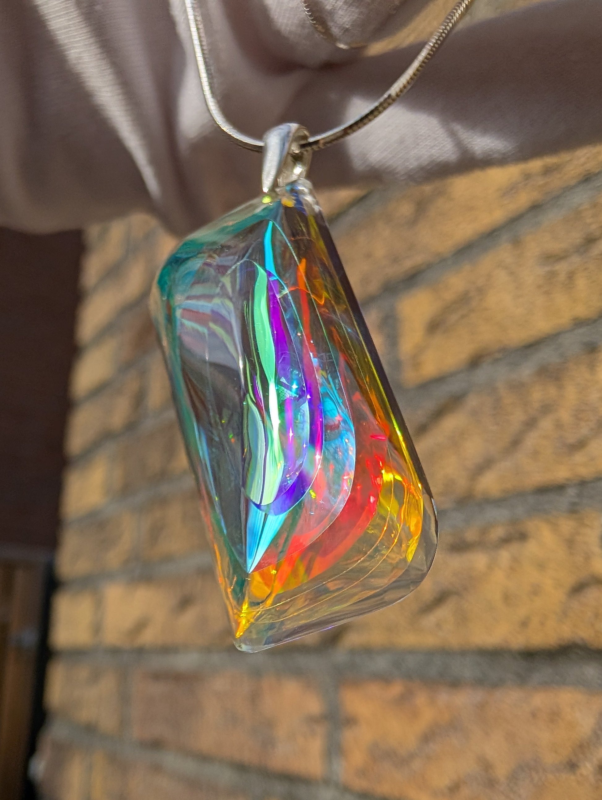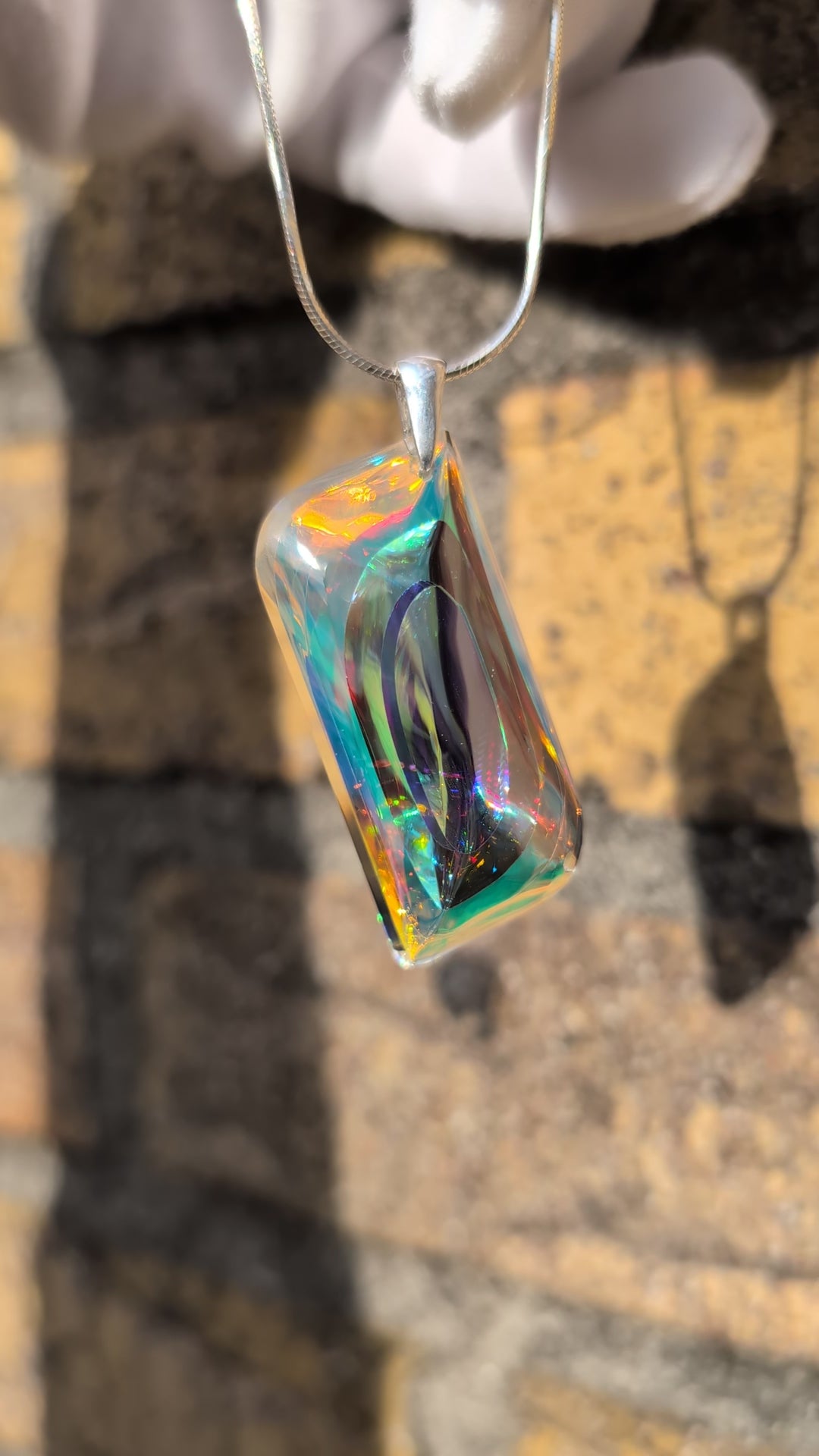 The sleek, modern design is complemented by a sterling silver (925) bail, ensuring both durability and elegance. The fusion of crystal-clear optical glass with vibrant dichroic layers creates an almost ethereal effect—each piece refracting light uniquely, making "Chen" a true wearable work of art.