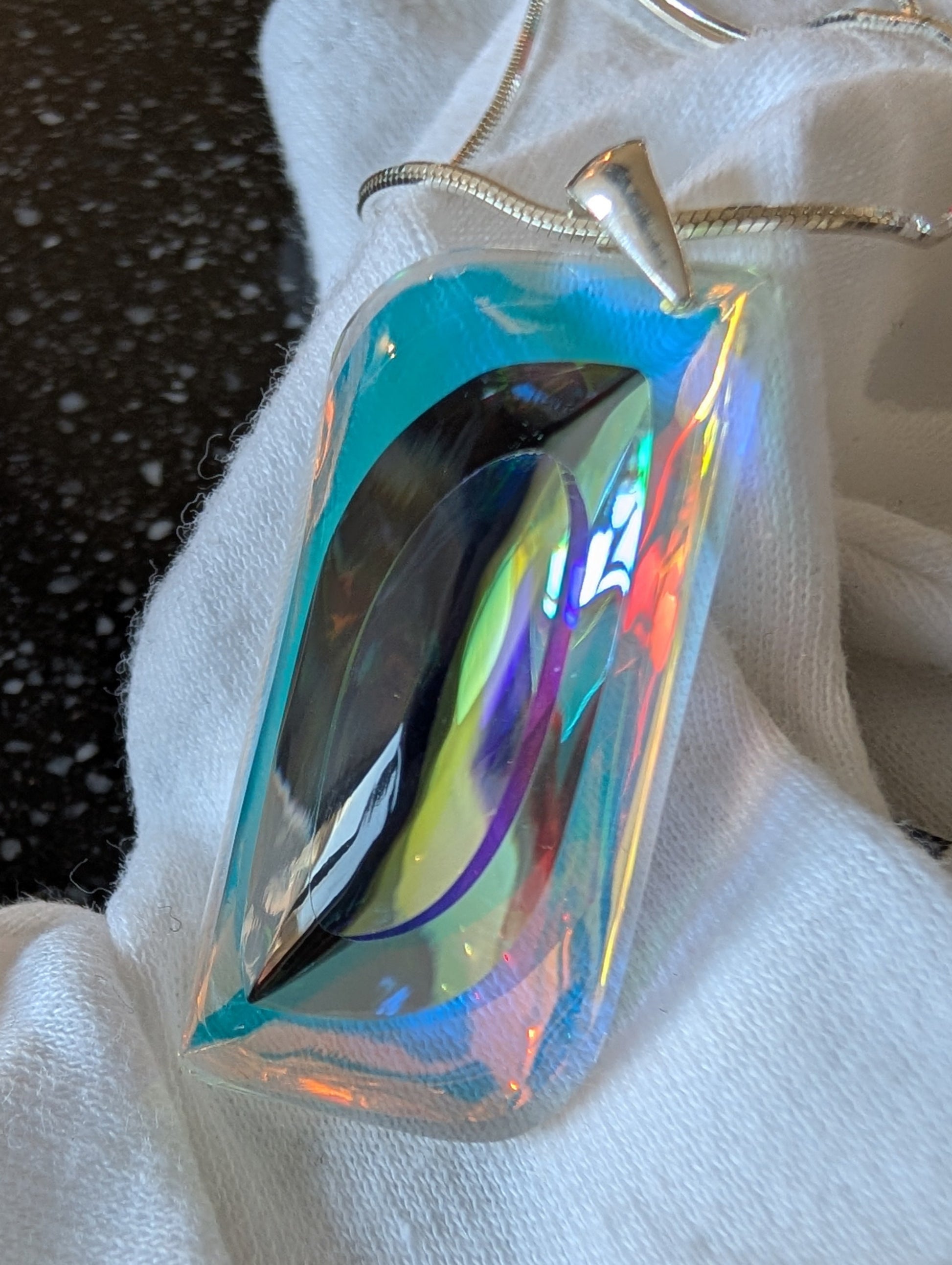 Chen – meaning grace or favor, a name that reflects elegance, charm, and the quiet beauty of simplicity. Chen is a one-of-a-kind handcrafted pendant, a fusion of dichroic and optical glass, meticulously shaped and polished by me through cold-working techniques. The glass catches and reflects light in a mesmerizing play of shifting colors, making every movement a dynamic display of brilliance.