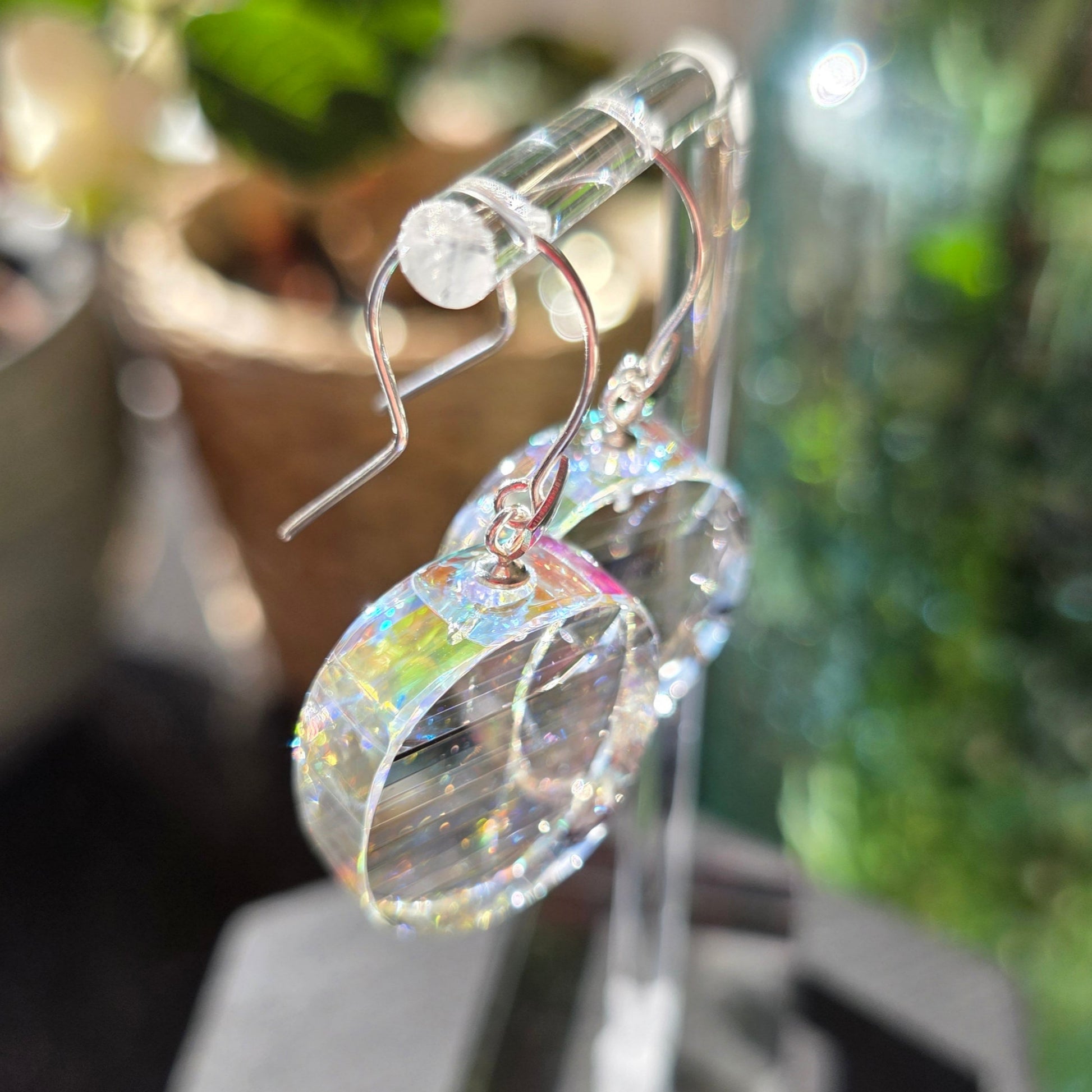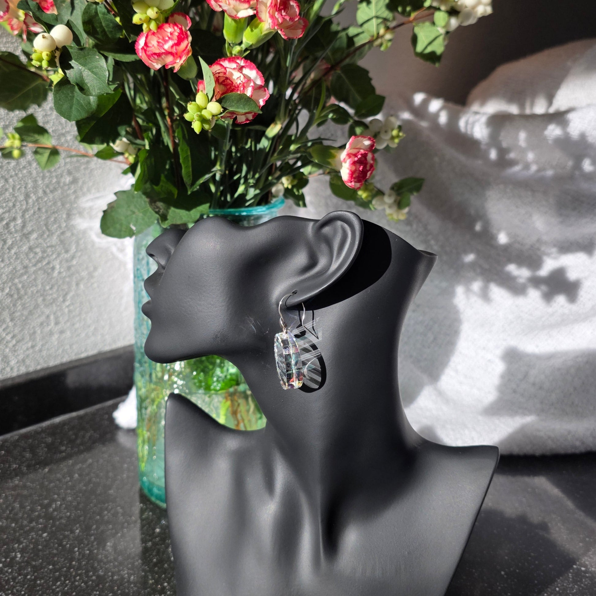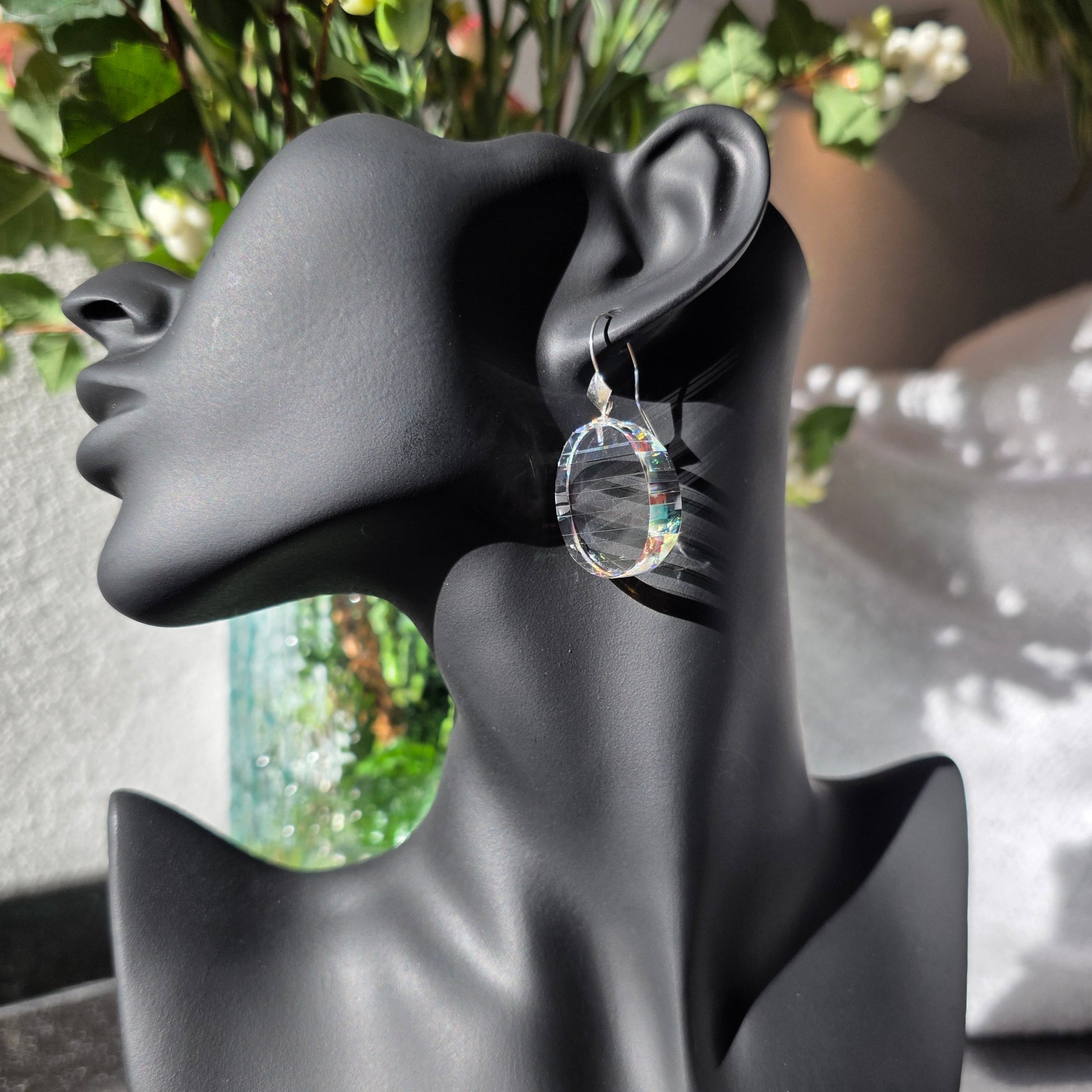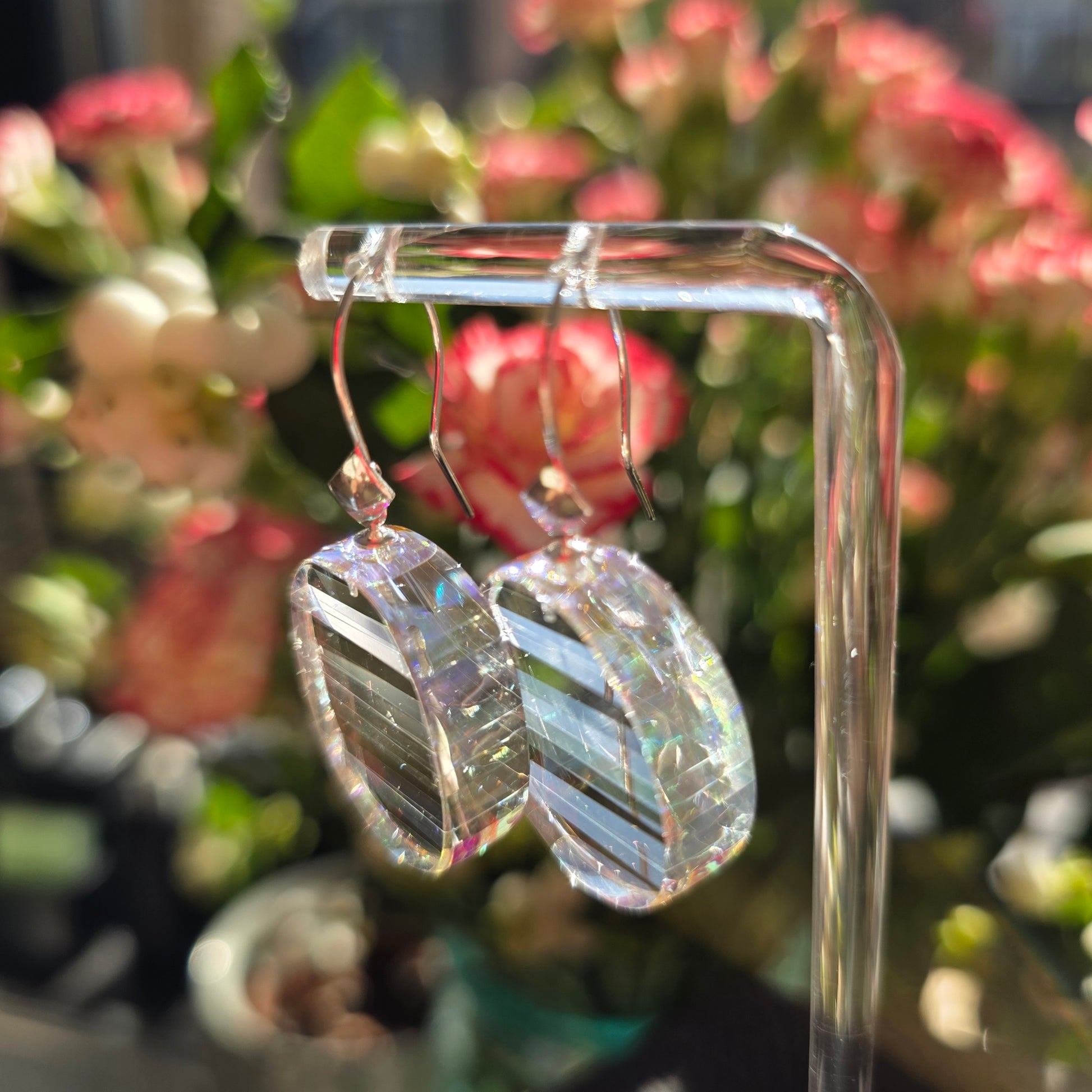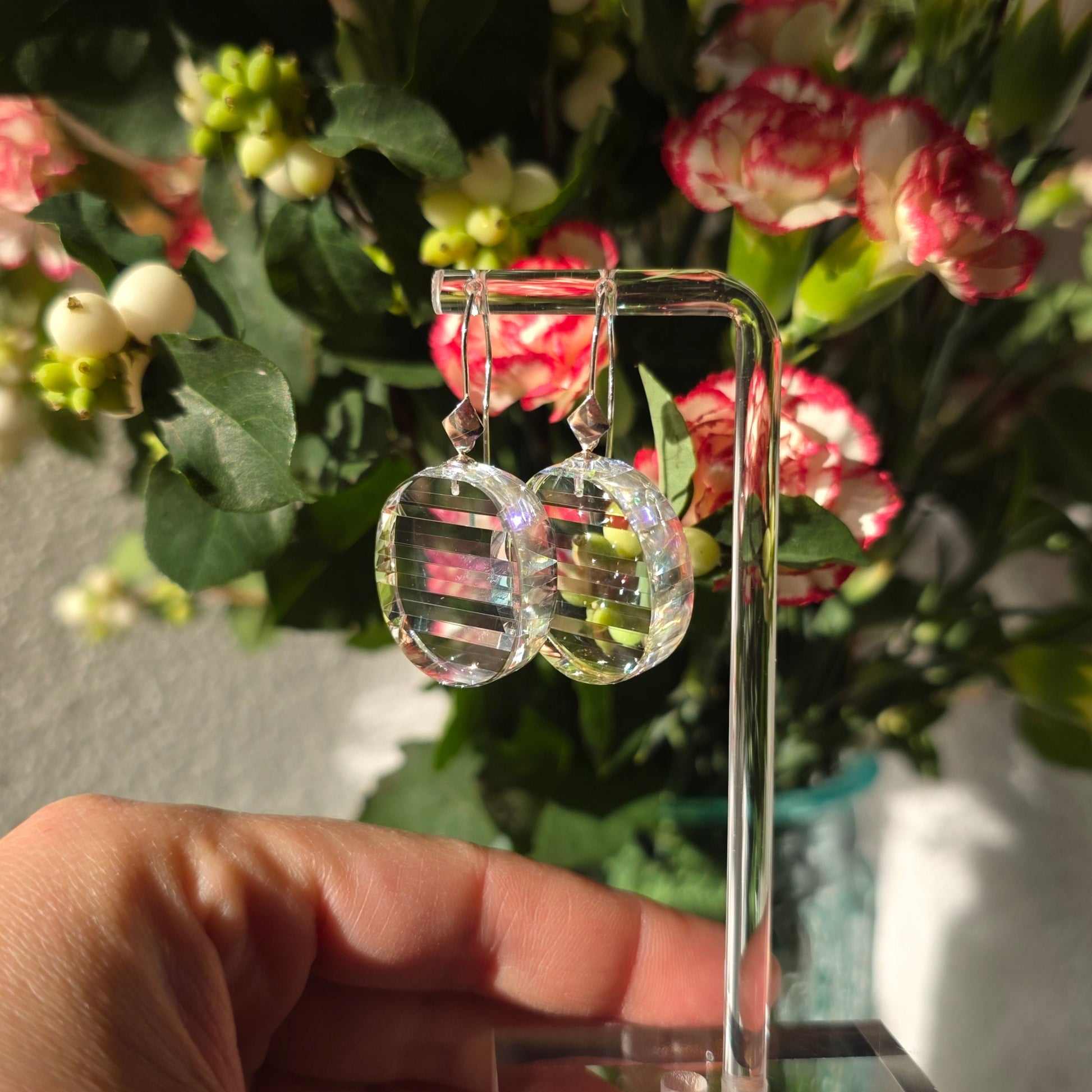 Dana – meaning wise or knowledgeable, a name tied to inner depth and clarity of thought. Dana is a refined celebration of light and movement, where sleek geometry meets radiant transparency. These earrings capture shifting colors within meticulously cut dichroic glass, creating an effect that feels both contemporary and timeless. Their oval form refracts light into delicate rainbows, dancing with every motion of the wearer.