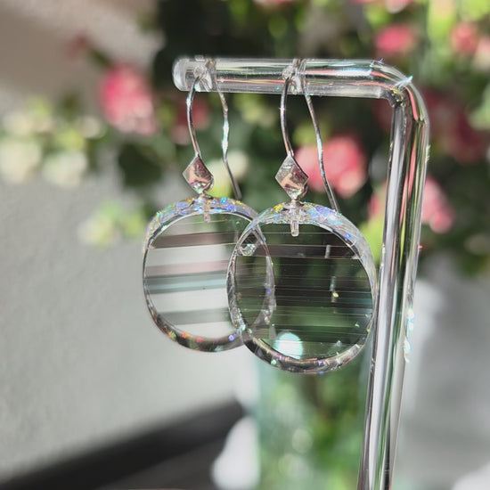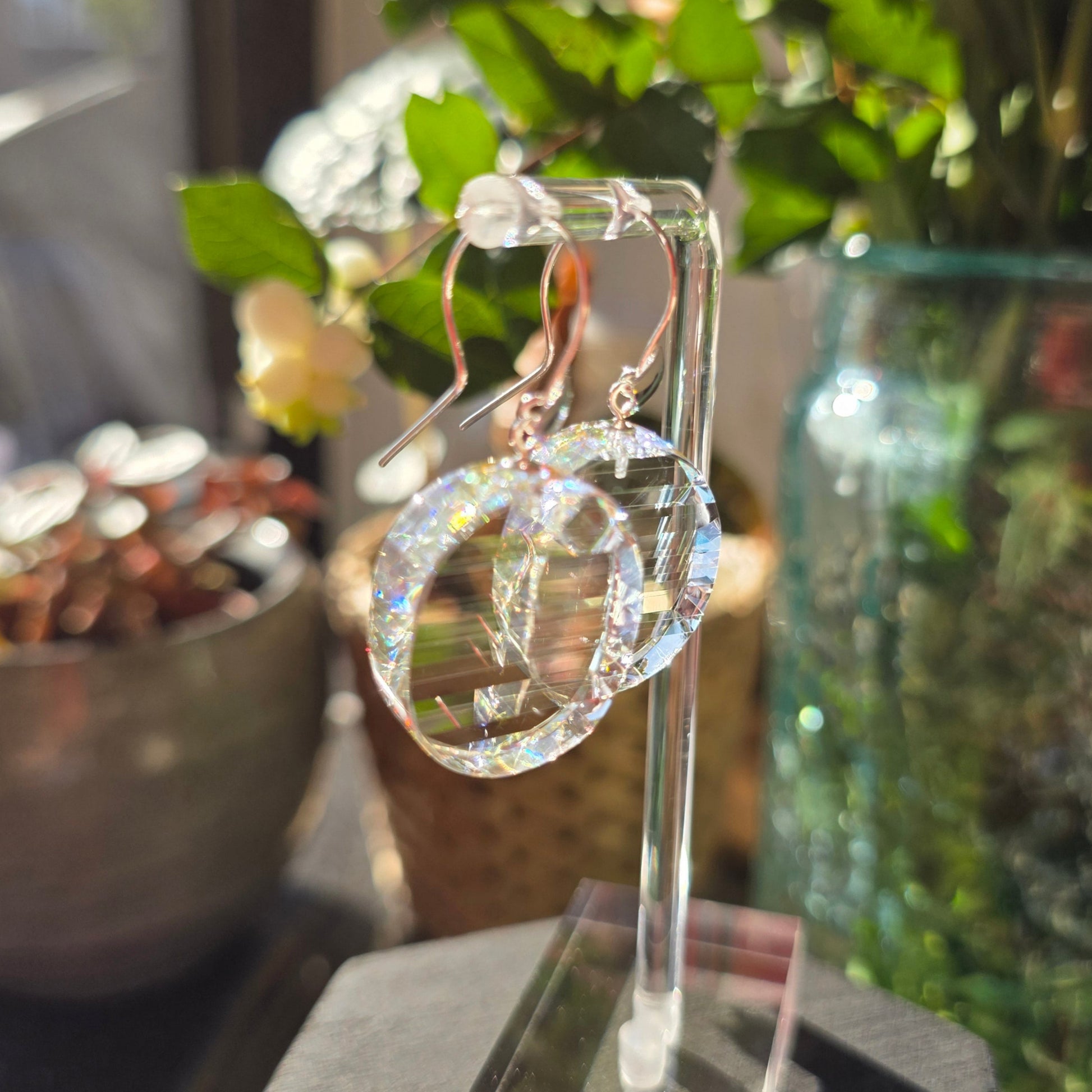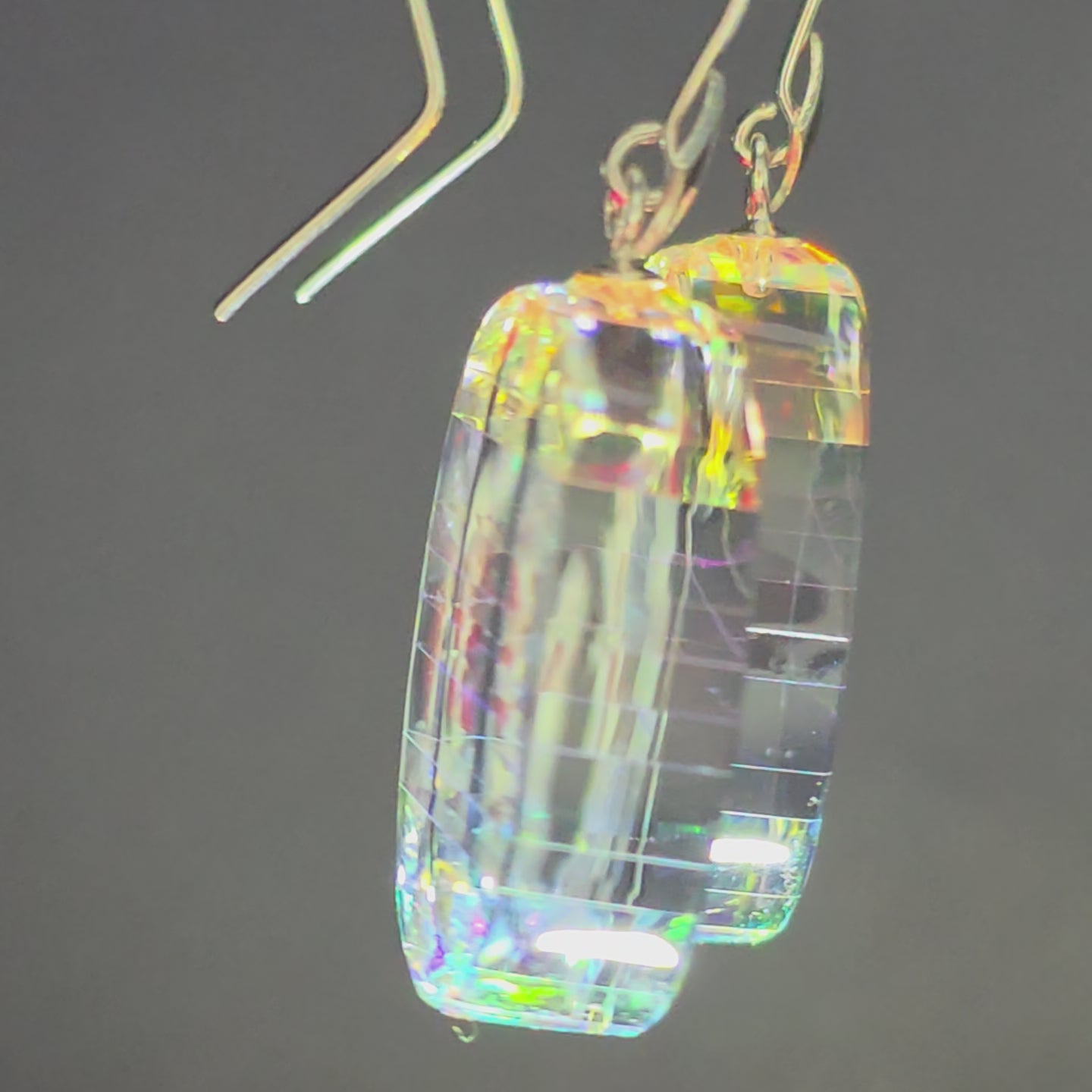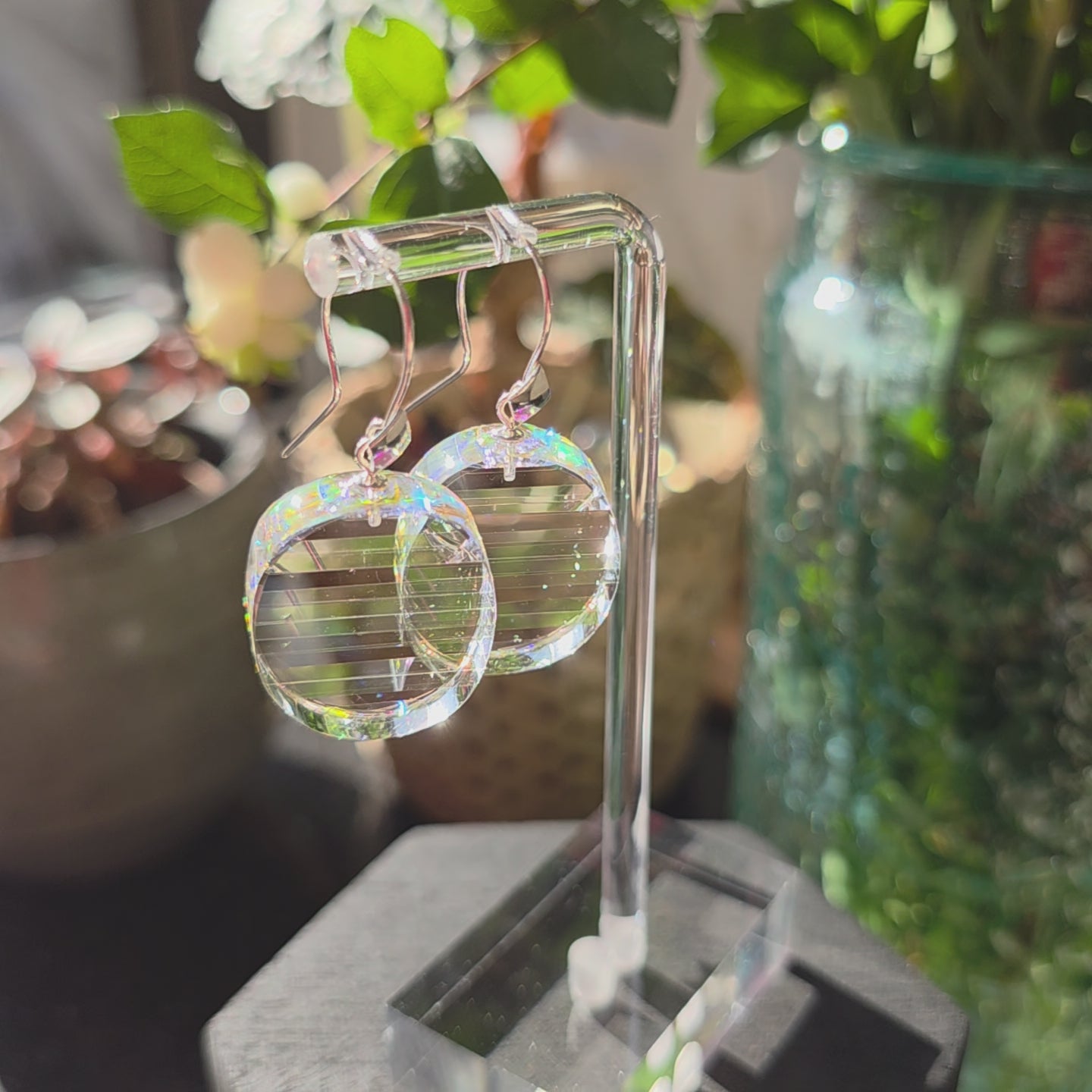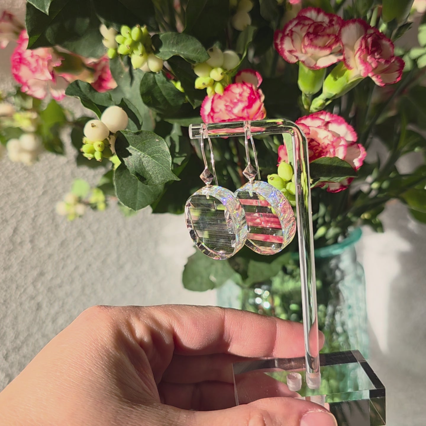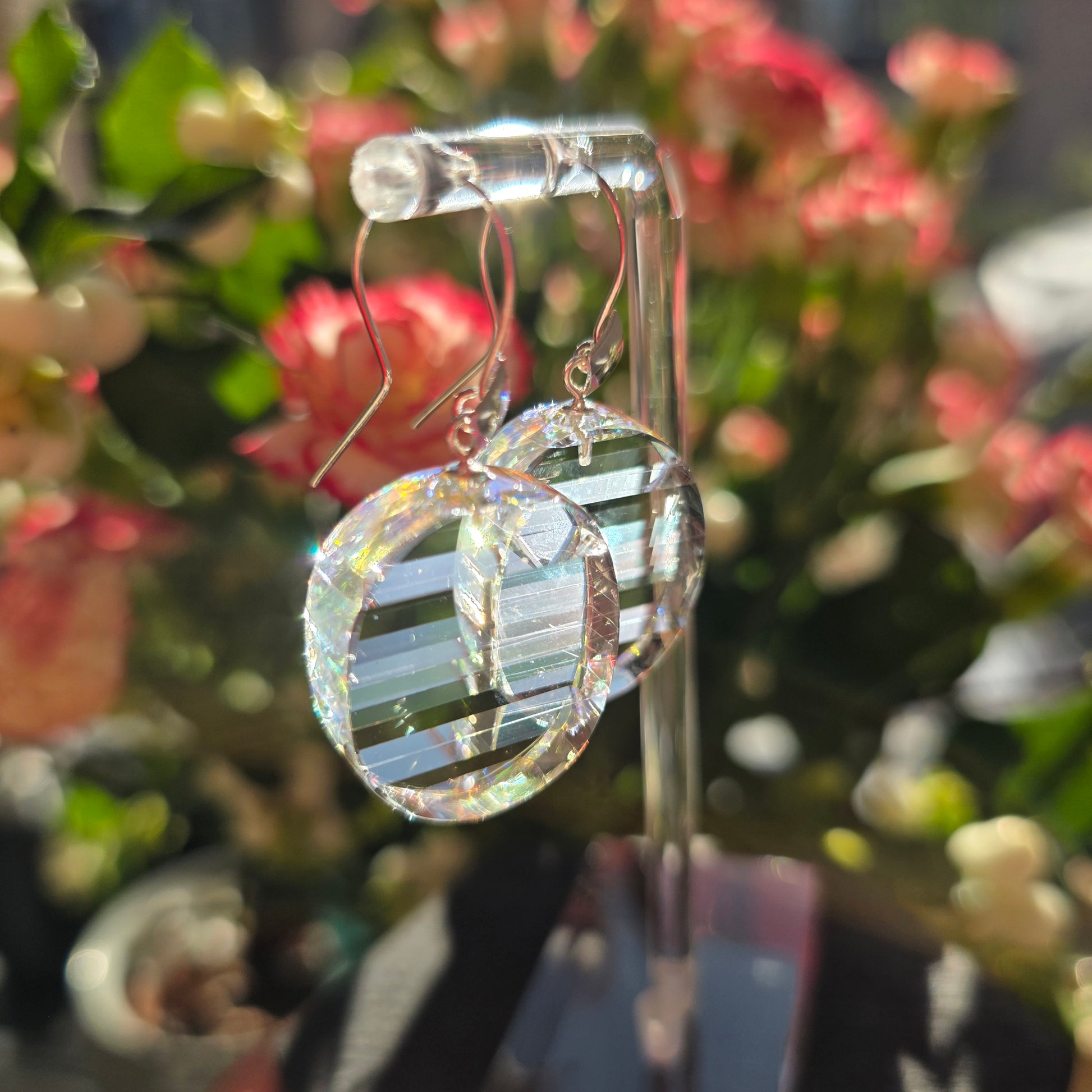 Dana – meaning wise or knowledgeable, a name tied to inner depth and clarity of thought. Dana is a refined celebration of light and movement, where sleek geometry meets radiant transparency. These earrings capture shifting colors within meticulously cut dichroic glass, creating an effect that feels both contemporary and timeless. Their oval form refracts light into delicate rainbows, dancing with every motion of the wearer.