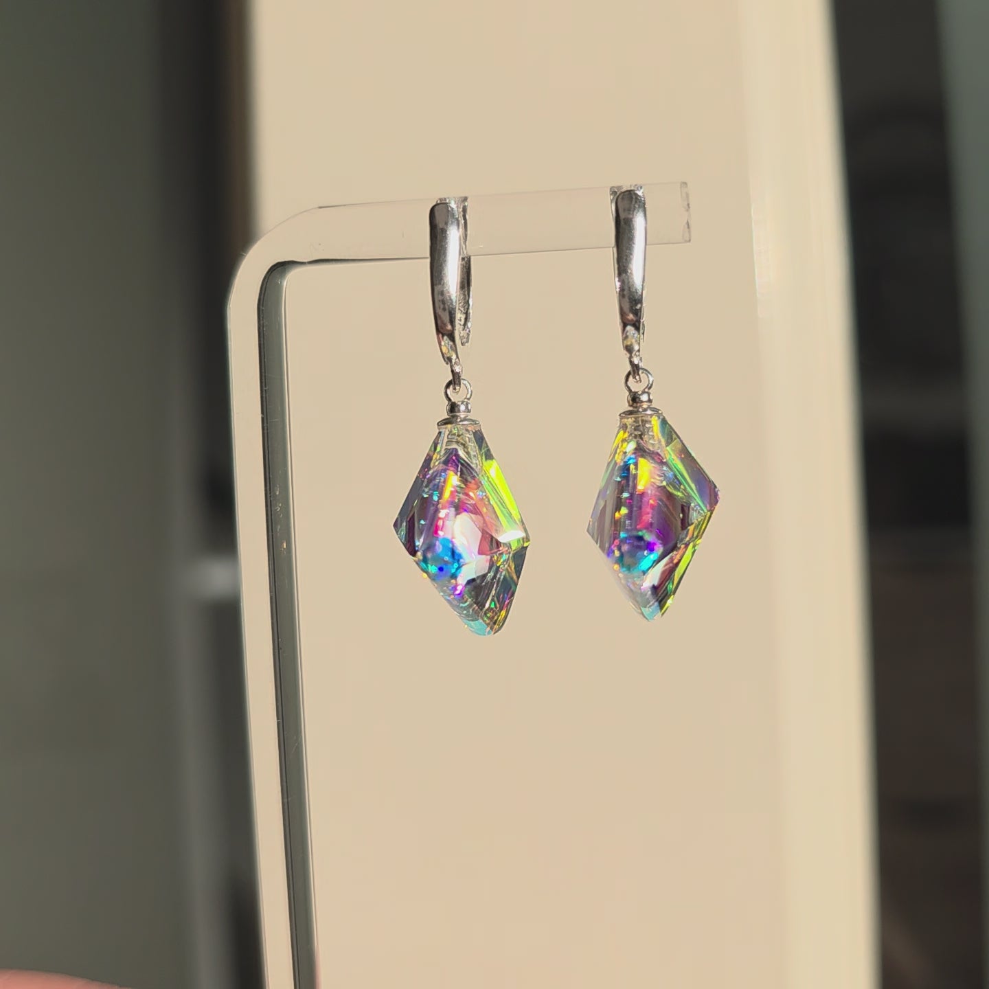 Each earring features an elegant, geometric sculpted form, alive with shifting color and delicate internal reflections. As they move, they cast glimmers of violet, teal, rose, and gold—small prisms that transform light into something almost ethereal. Their compact, modern silhouette makes them striking yet effortlessly wearable.