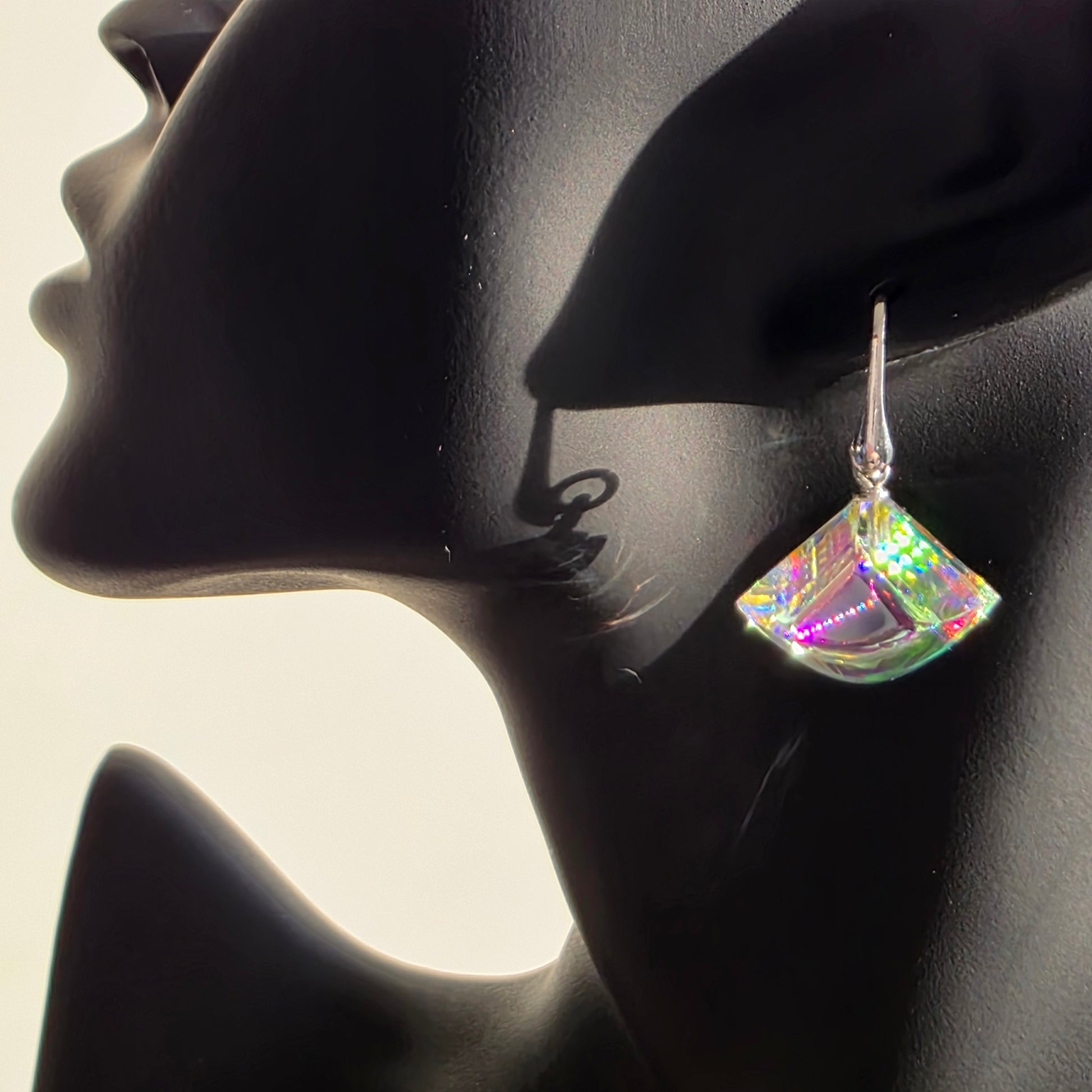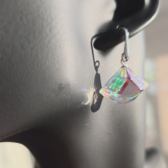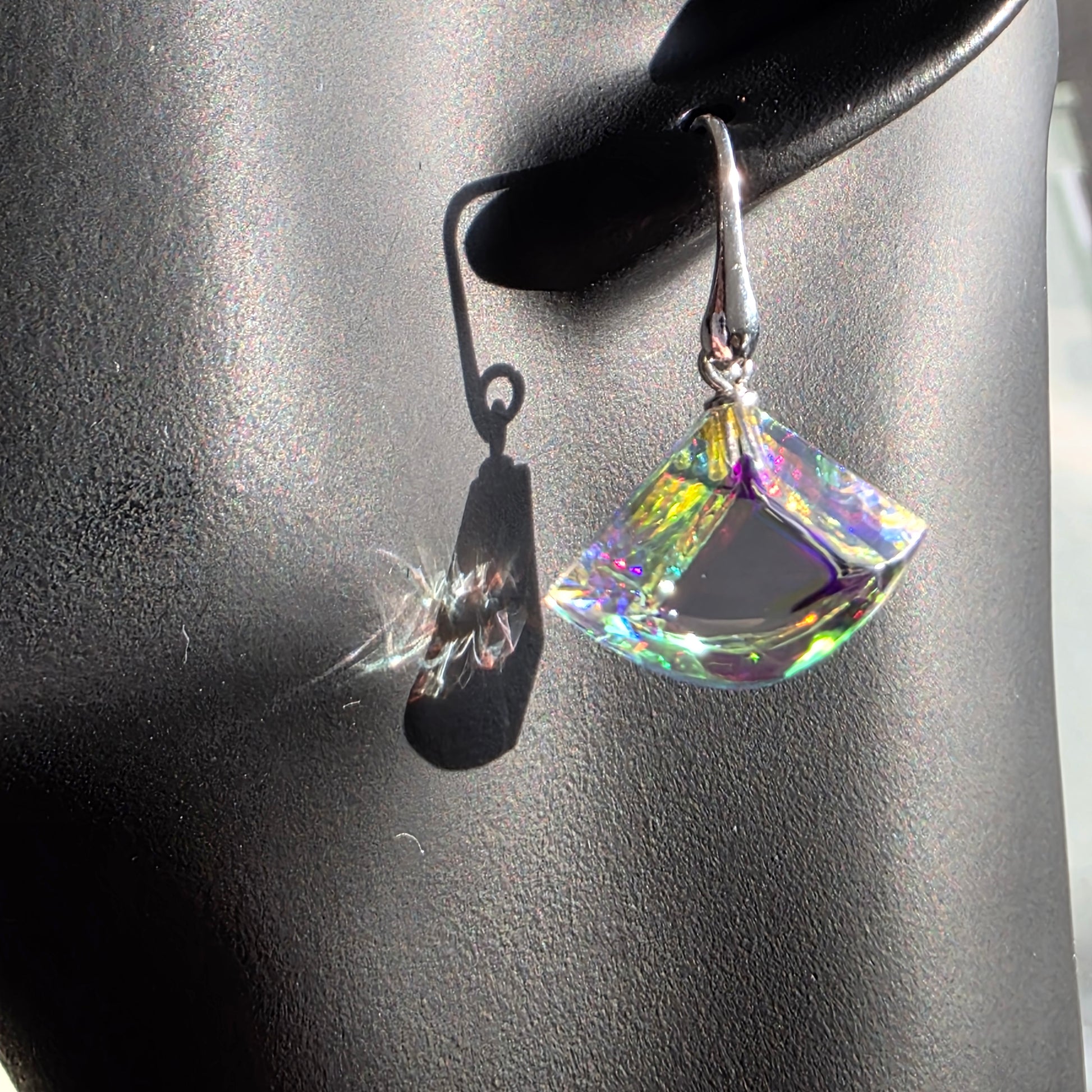 Keshet – meaning rainbow in Hebrew, a name that captures wonder, harmony, and the promise of light after rain. These earrings embody that spirit beautifully: a glimmering arc of color and radiance, sculpted from dichroic glass to reflect shifting hues with every movement.