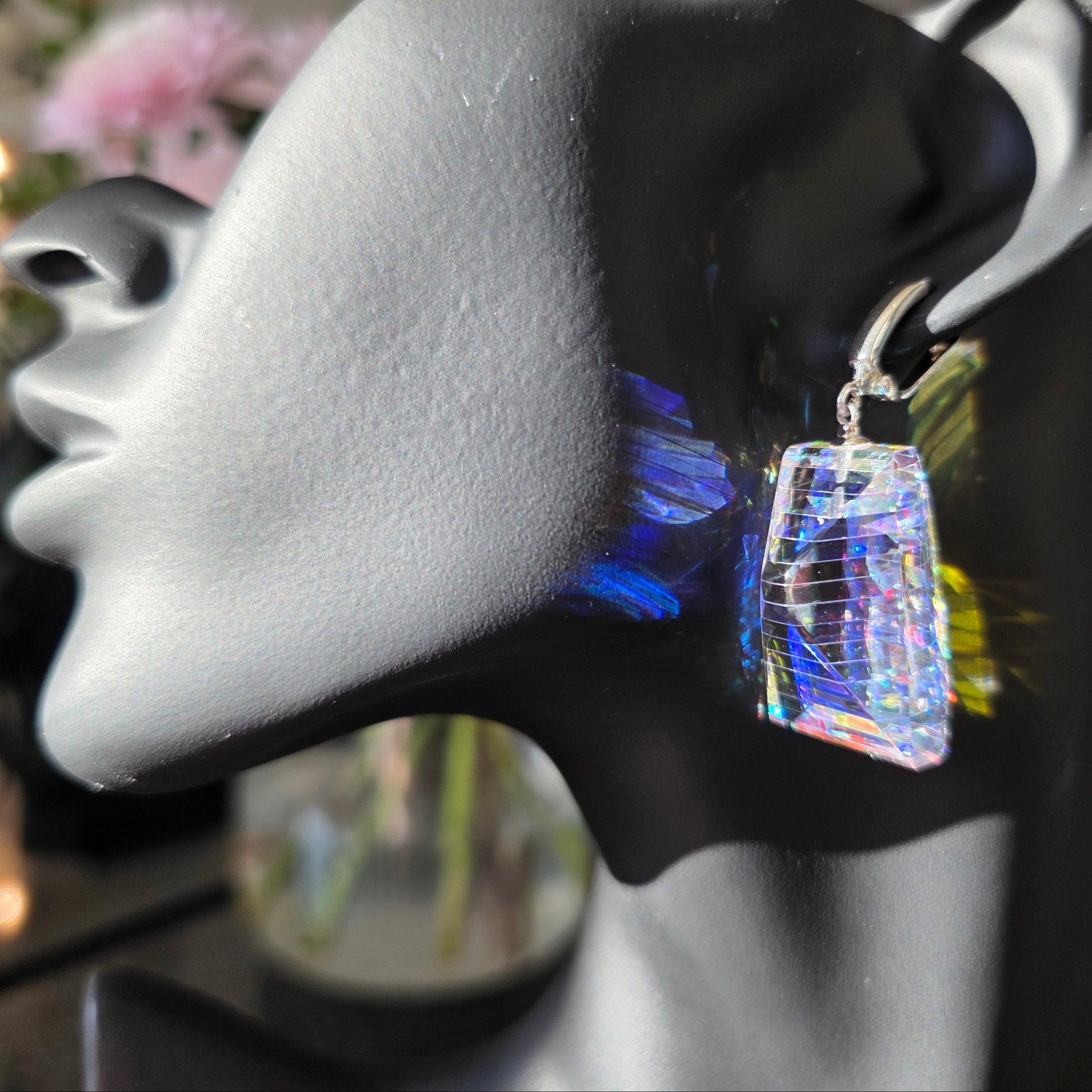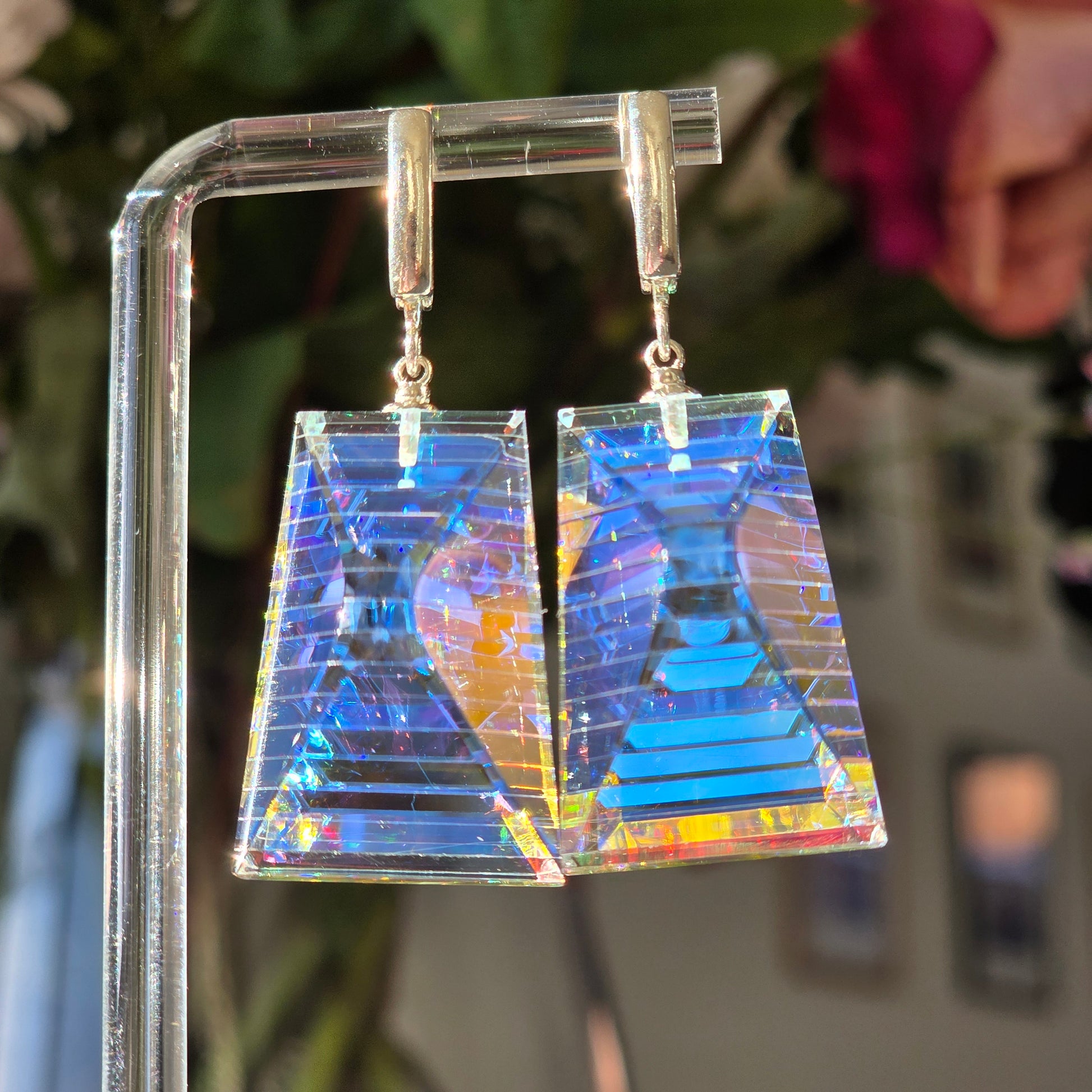 Moran is a radiant expression of light captured within structure. Handcrafted from dichroic and optical glass, these earrings reveal layered iridescence—soft blues, gold flashes, and prismatic reflections suspended within crystalline clarity. Their tapered architectural silhouette creates depth from every angle, transforming movement into a display of shifting brilliance.