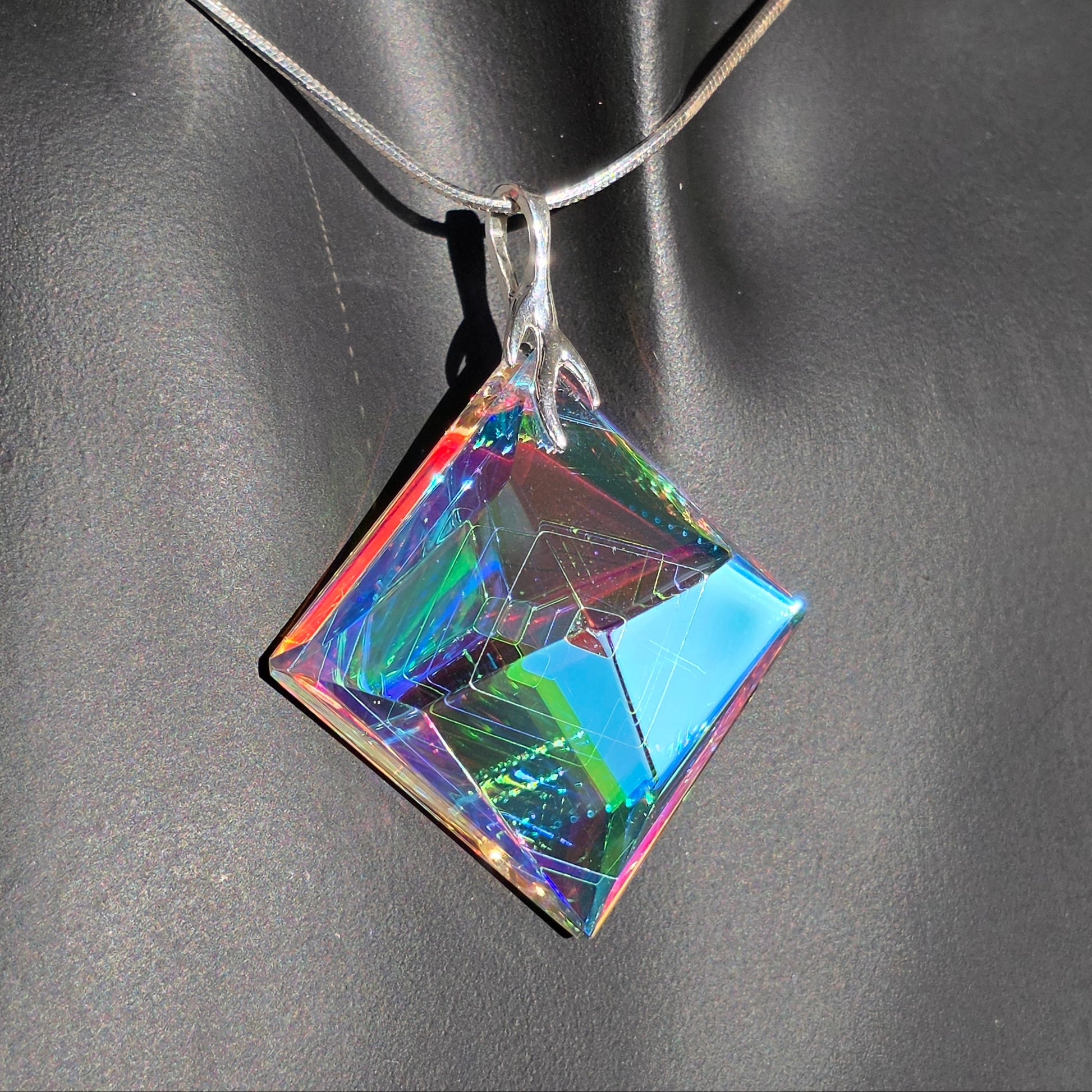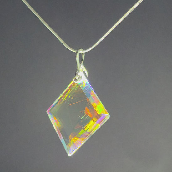 Neta is a meticulously handcrafted pendant sculpted from dichroic and optical glass. Its geometric, faceted silhouette forms a luminous prism, capturing and refracting light into shifting veils of emerald, sapphire, rose, and gold. At its center, a subtle internal pyramid creates depth and architectural intrigue, as if light itself has taken root within the glass.