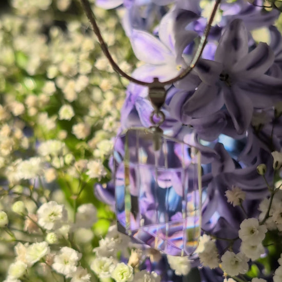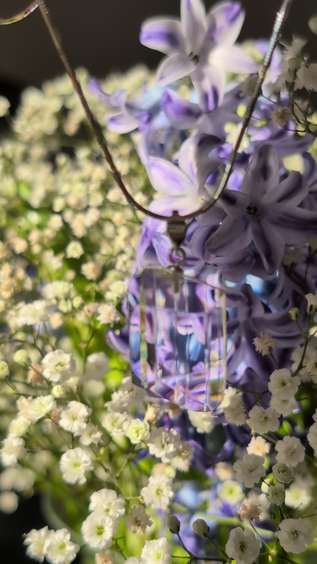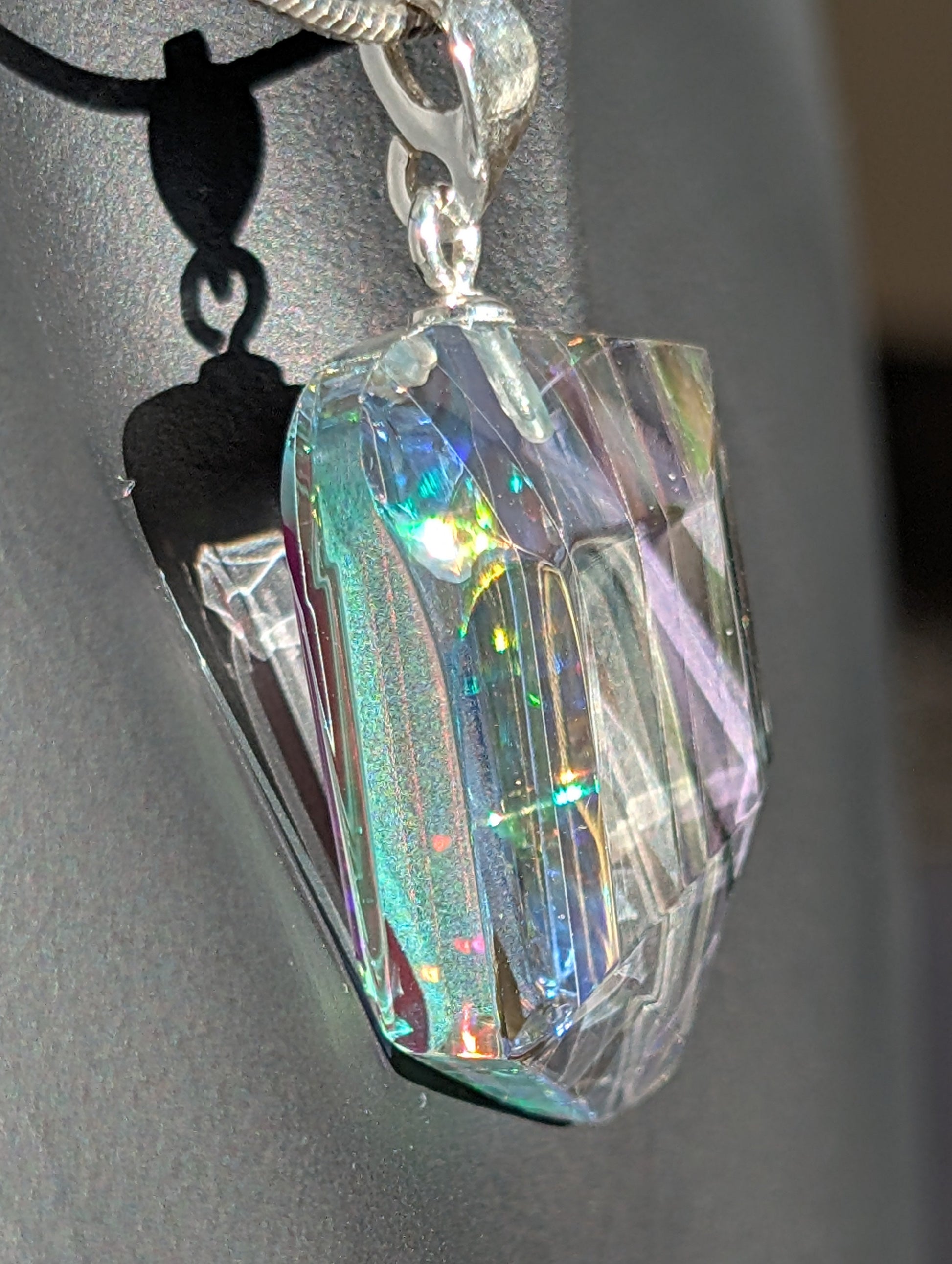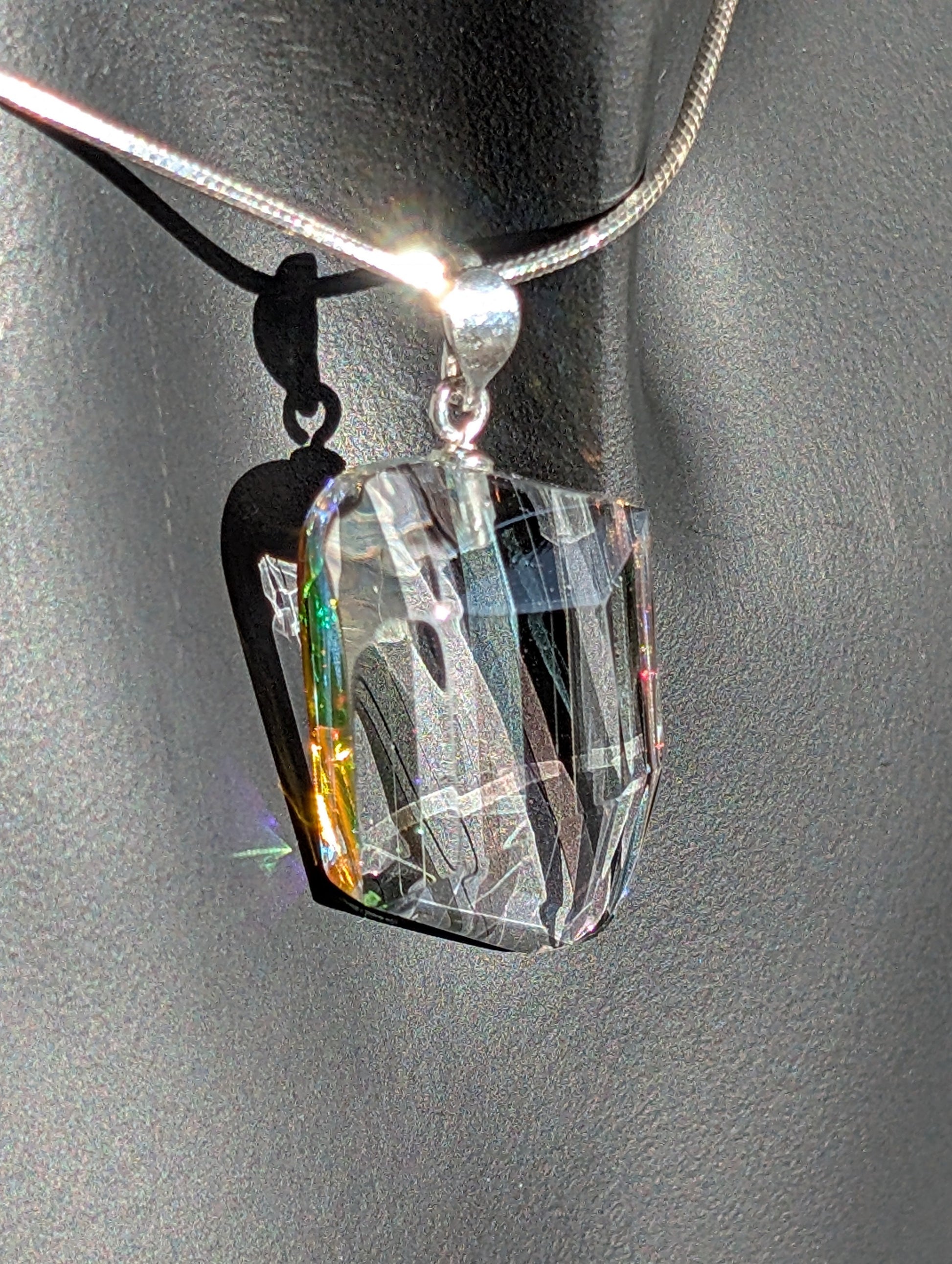 Orit – meaning light or radiance, a name resonating with brightness, purity, and grace. Orit, is a refined pendant sculpted from dichroic and optical glass, designed to capture and transform light with every angle. Its faceted structure creates a mesmerizing display of reflections, shifting between crisp silvers, deep ambers, and iridescent highlights, giving the piece an almost liquid luminosity.