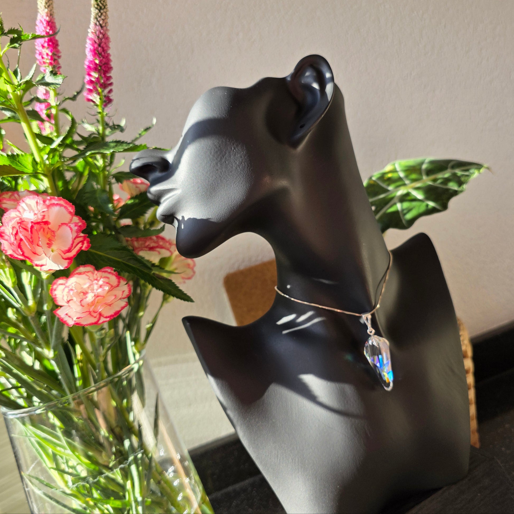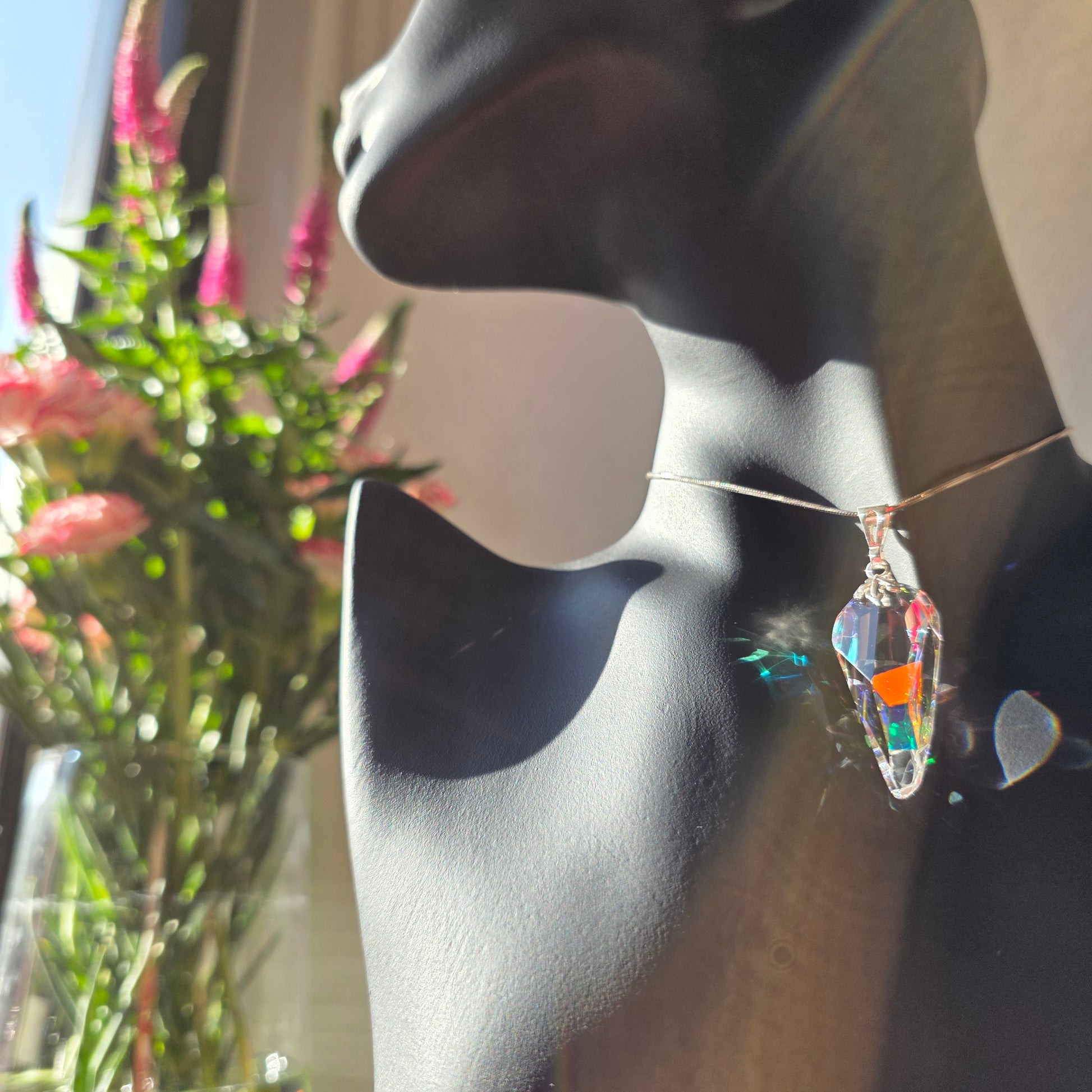 Yael – a name meaning “ibex” or “mountain goat”, symbolizing grace, agility, and resilience – is a pendant that captures both strength and elegance in luminous form. Handcrafted from dichroic and optical glass, Yael’s faceted body refracts light into radiant flashes of emerald, amber, and sapphire, shifting as though alive with movement. Its refined geometry and prismatic glow make it a jewel that feels timeless yet strikingly modern.