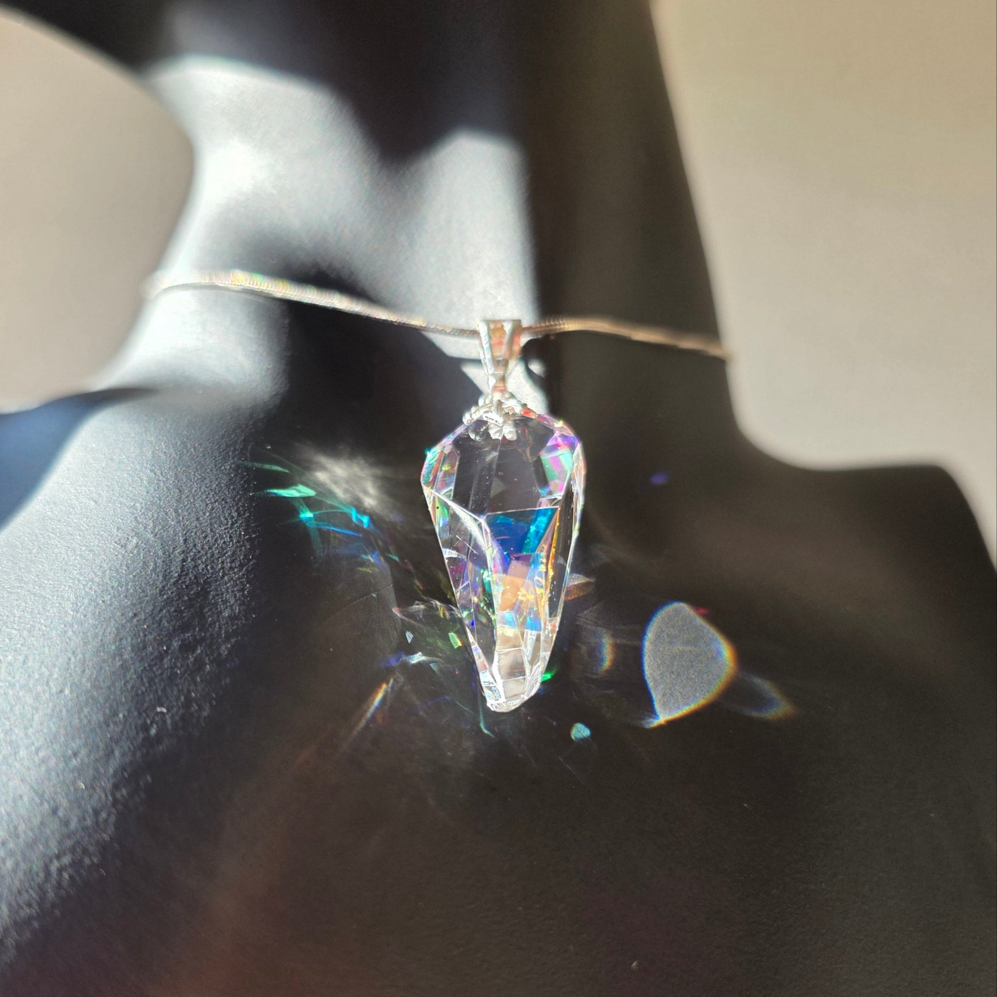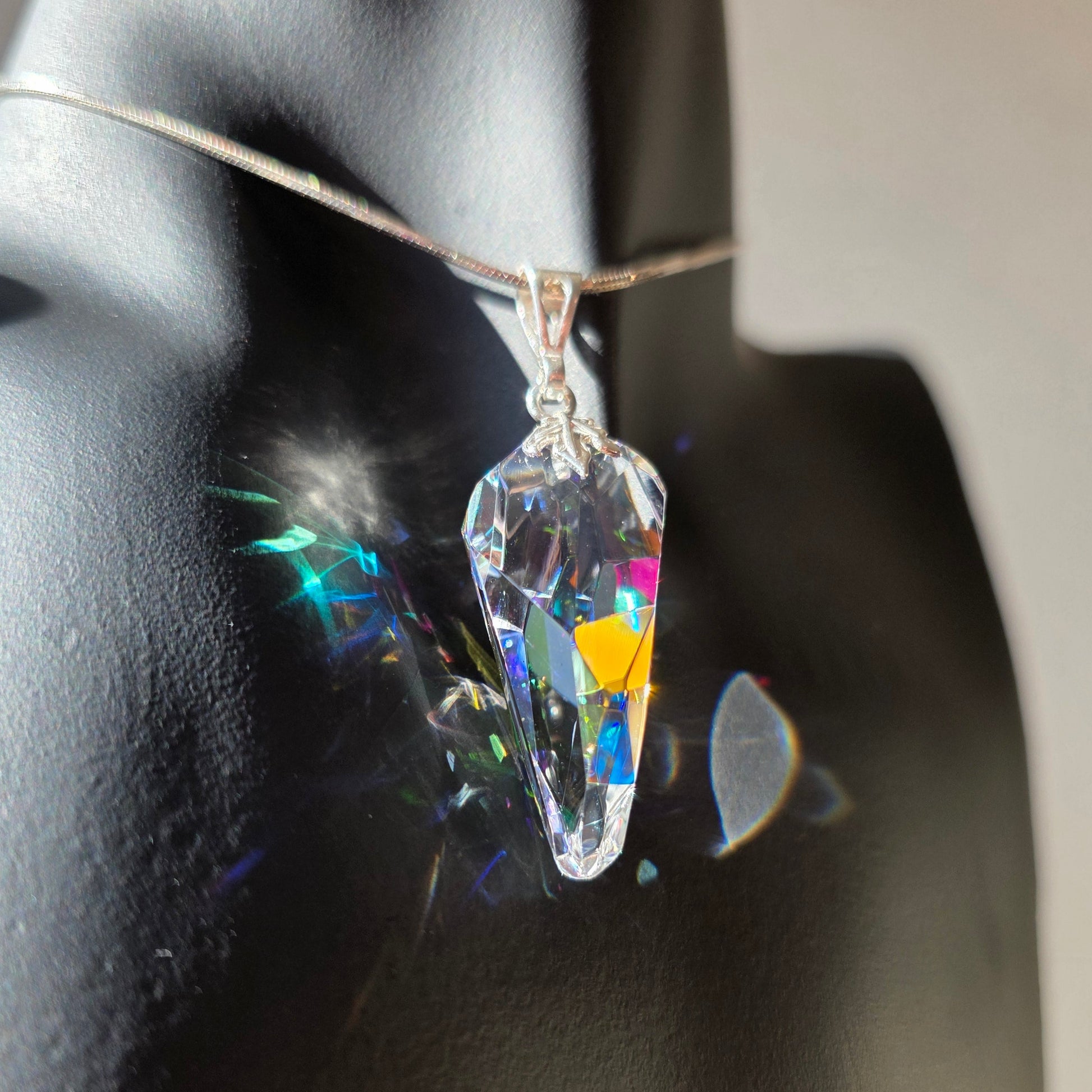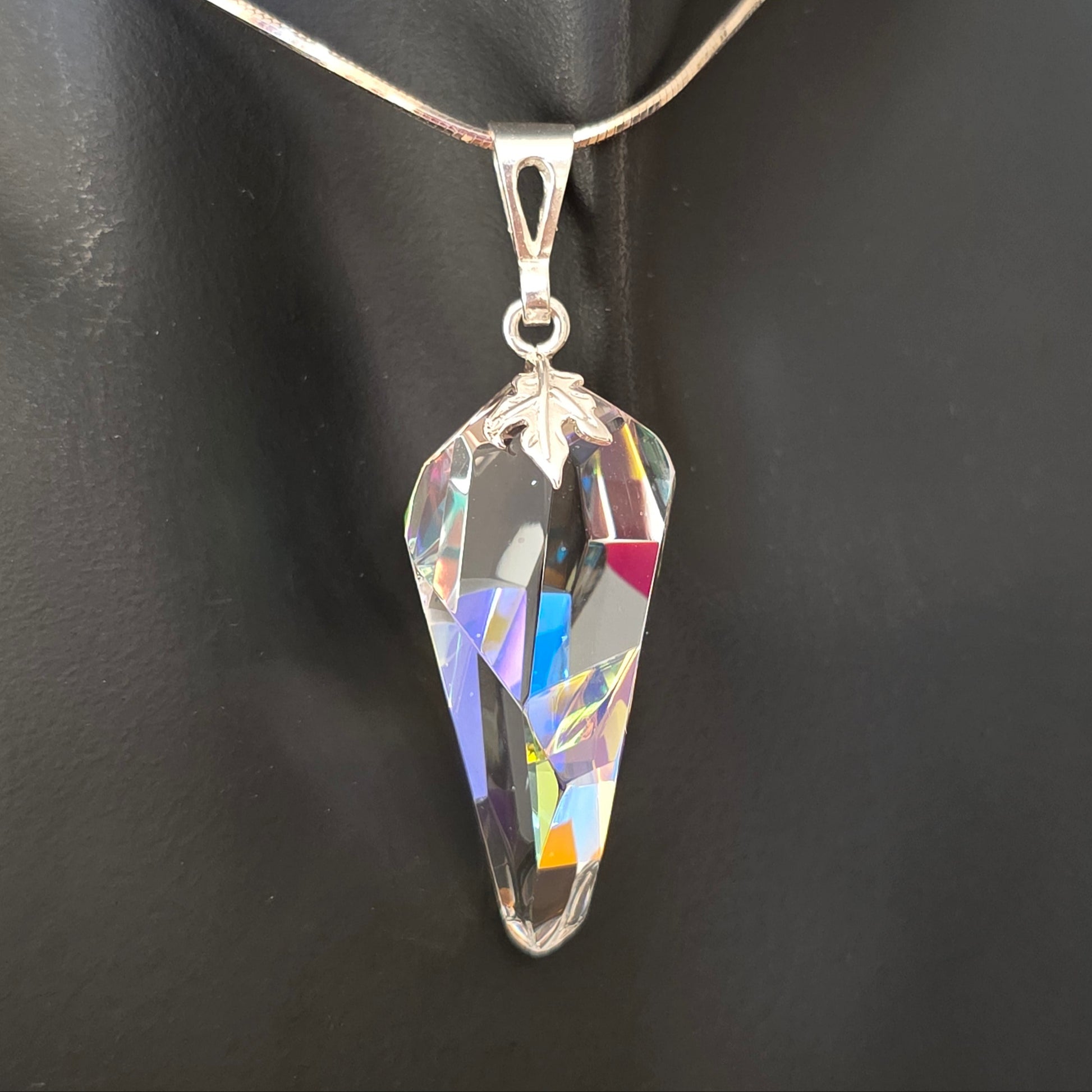 - Form: Faceted pendant with elongated geometric silhouette